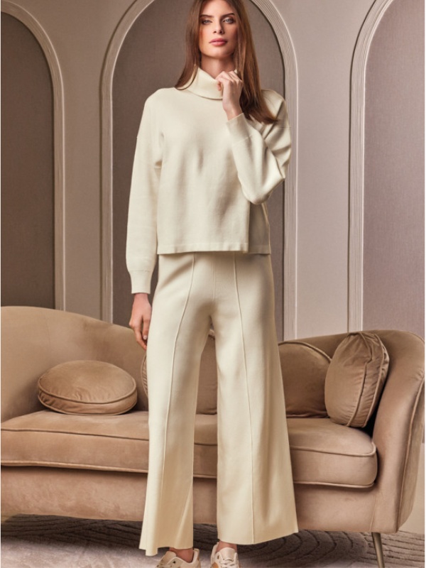 Горната част е блуза с дълъг ръкав и висока яка тип turtleneck, изработена от меко плетиво, което осигурява топлина и изискан вид.